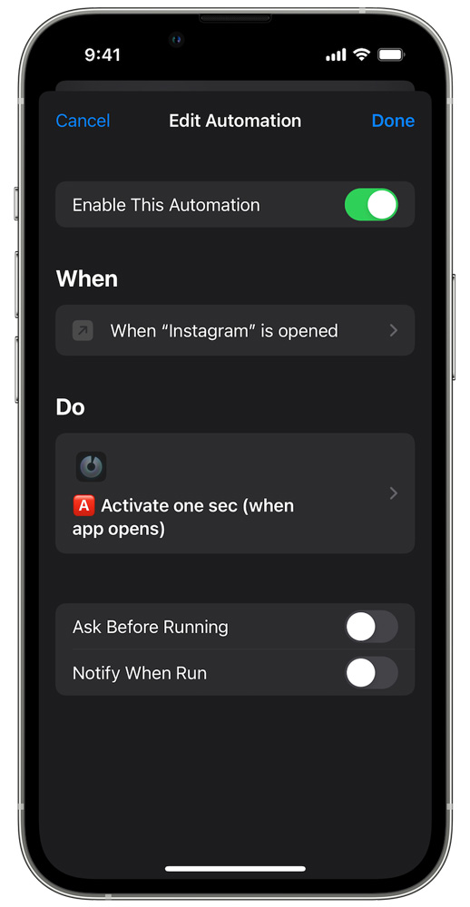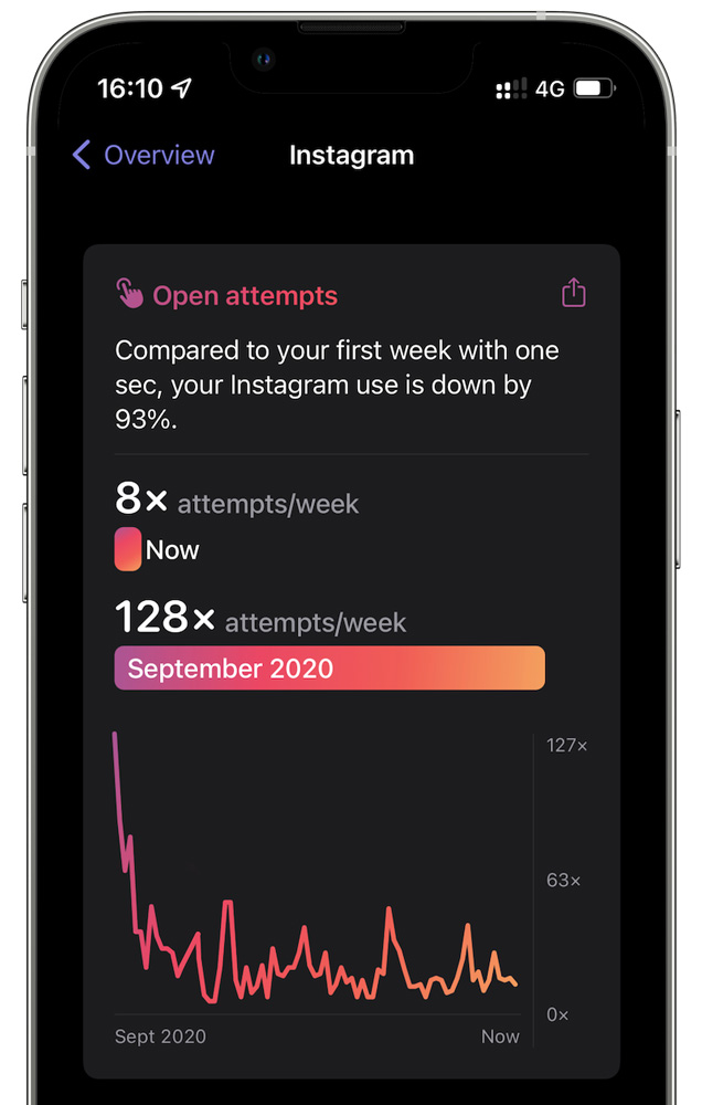 - Mode de concentration : One sec bloque totalement l’ouverture de certaines applications sociales pour aider l’utilisateur à rester focus.