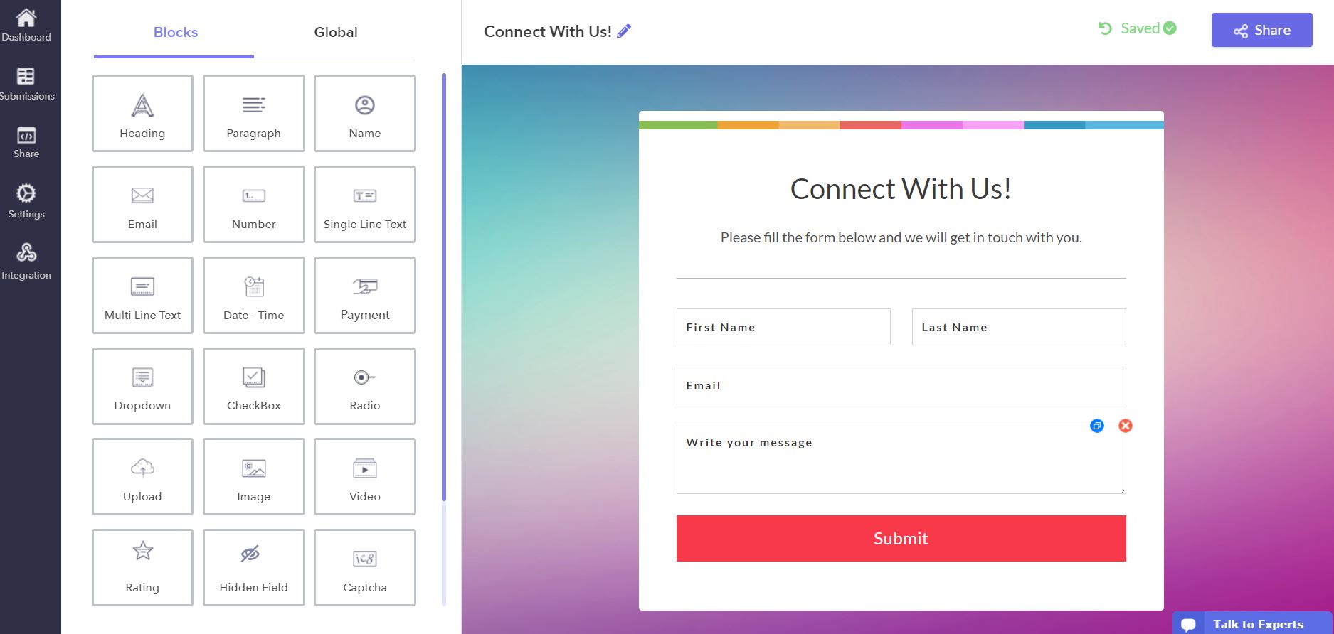 Il est possible de créer des formulaires intuitifs qui peuvent être partagés en copiant un simple lien ou qui peuvent être directement intégrés dans le contenu d’une page web ou sous forme de pop-ups. Vous pouvez paramétrer facilement une page de remerciement, des réponses automatiques, des paiements en ligne et programmer un jour et une heure de publication pour un formulaire.