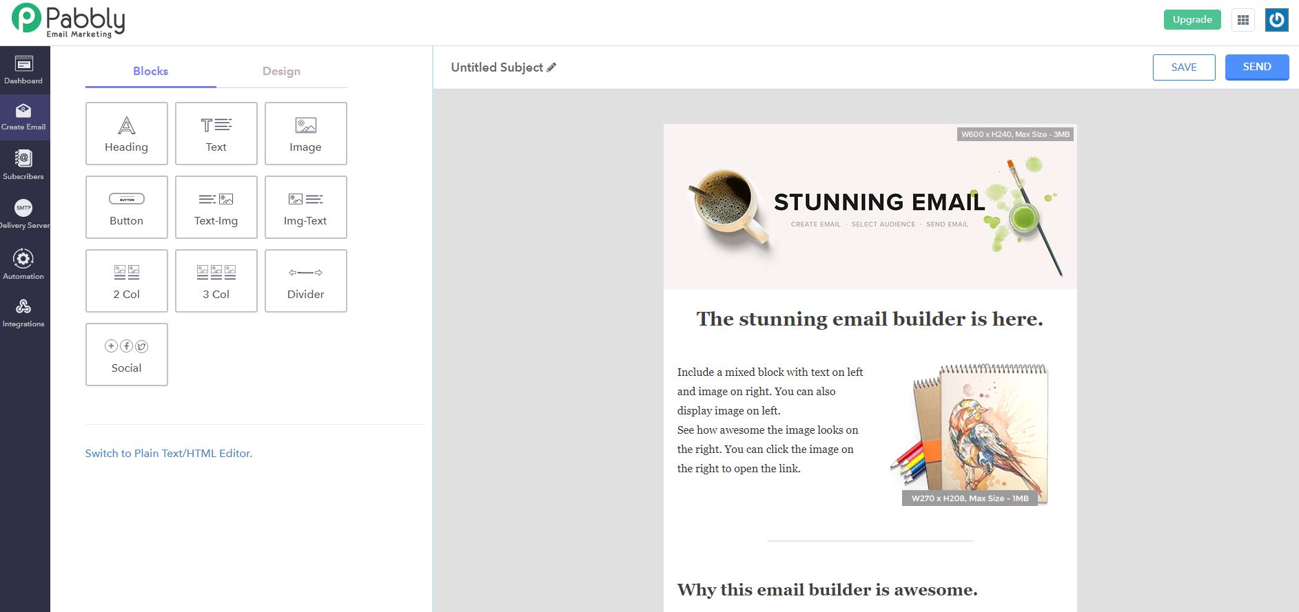 Concernant les emails marketing, l’outil est doté d’un éditeur drag & drop facile à appréhender, sans compétences techniques nécessaires. En supplément, vous avez la possibilité de gérer vos listes d’abonnés, de sélectionner une plateforme de messagerie pour envoyer vos emails (Pabbly, Gmail/GSuite, Pepipost ou Amazon SES), de mettre en place du marketing automation et d’intégrer Google Analytics.