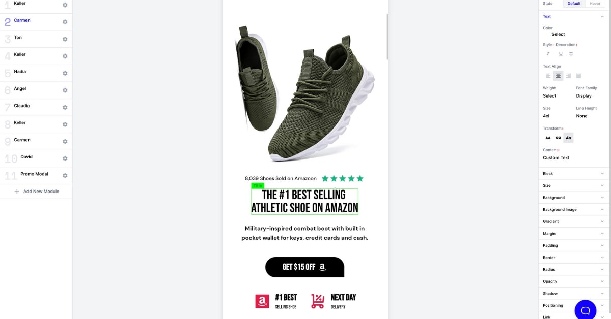 L’éditeur est facile à prendre en main grâce à son système de glisser-déposer. Vous pouvez ajouter différents éléments selon vos besoins : textes, titres, images, vidéos, fiches produits, formulaires, CTA… Ajustez également l’alignement, la taille du bloc, l’arrière-plan, les bordures, et les marges. Vous accédez à une prévisualisation de pages sur tous les devices (ordinateur, tablette, mobile).