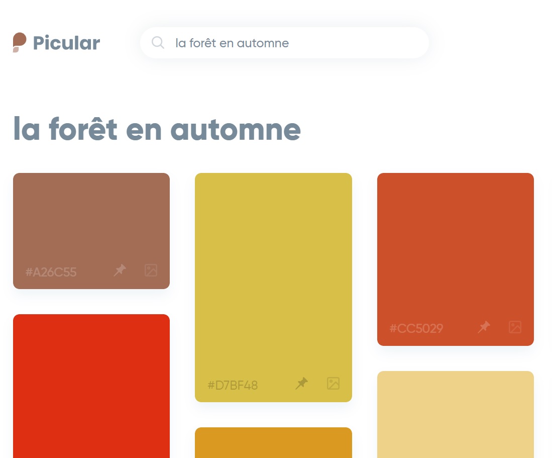 - Effectuer une recherche de tonalités : trouvez vos couleurs en renseignant des mots-clés dans la barre de recherche. Picular vous propose des tonalités en lien avec votre requête. Le texte peut s’écrire en français ou dans une autre langue.