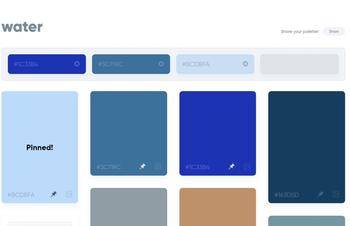 - Épingler vos couleurs préférées : vous avez la possibilité de sauvegarder jusqu’à 8 couleurs différentes. Les tonalités épinglées se retrouvent alors dans un encart et vous pouvez continuer votre recherche sans risquer de les perdre.