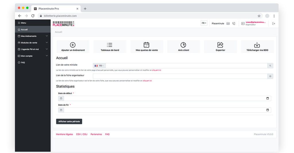 PlaceMinute est une solution de billetterie en ligne permettant de faciliter la vente et la réservation de tickets sur le web. Destiné aux professionnels, cet outil, accessible depuis n’importe quel navigateur web, offre la possibilité de créer une billetterie personnalisée, de promouvoir efficacement ses événements et de gérer sa base de données clients.