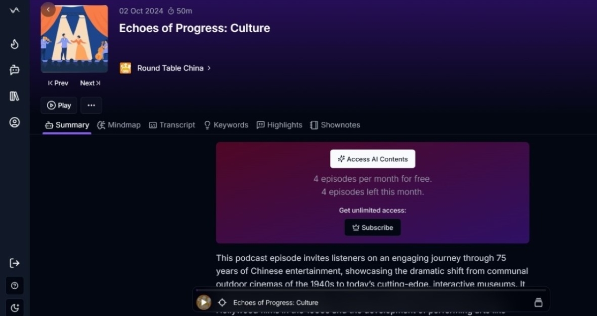 - Résumé d’épisodes : Podwise peut générer des résumés concis d’un épisode de podcast ou d’une vidéo pour vous permettre de saisir rapidement les points essentiels sans écouter l’intégralité du contenu.