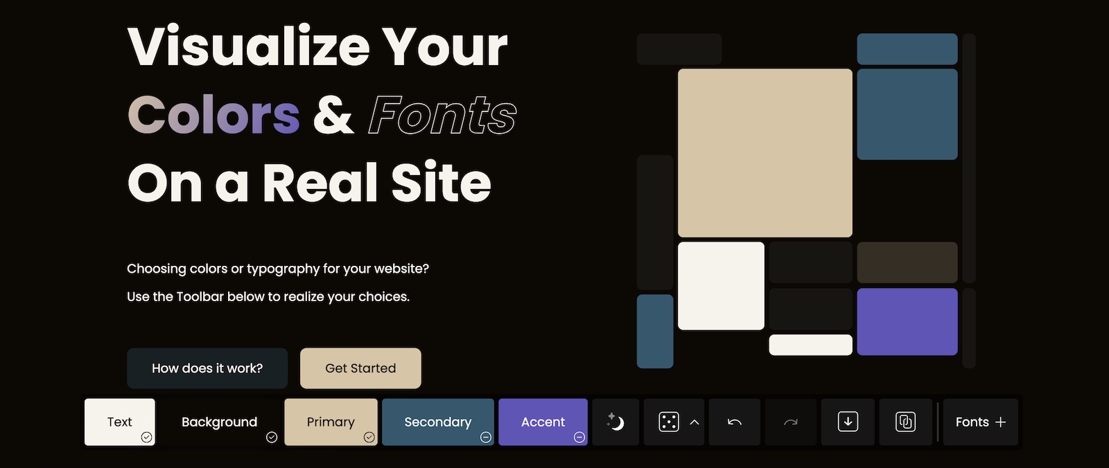 Épurée et simple d’utilisation, la plateforme adopte la structure d’un site web traditionnel, mis à part qu’elle est équipée d’une barre d’outils. Placée en bas de page, celle-ci permet d’expérimenter une variété de teintes pour les typographies, l’arrière-plan, les hyperliens ou les CTA. En cas de panne d’inspiration, Realtime Colors propose la fonctionnalité Randomized Colors, qui suggère des associations de couleurs complémentaires et adaptées.