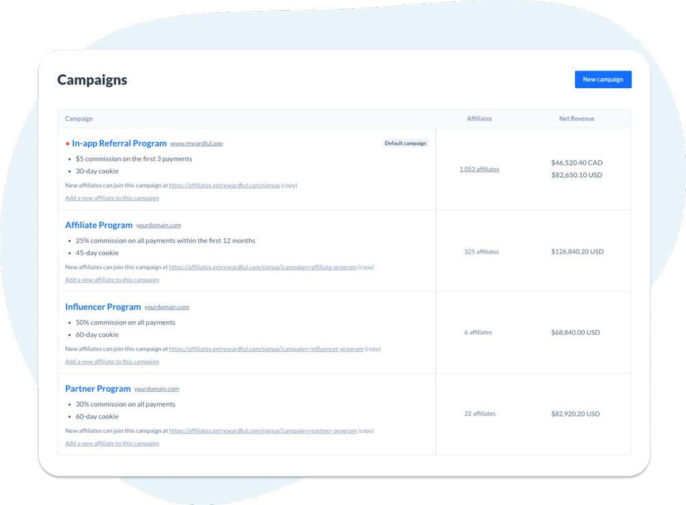 - Système de récompenses : les entreprises peuvent configurer les récompenses attribuées aux différents partenaires (commission unique, récompenses personnalisables en fonction des revenus de parrainage générés, remises, etc.).