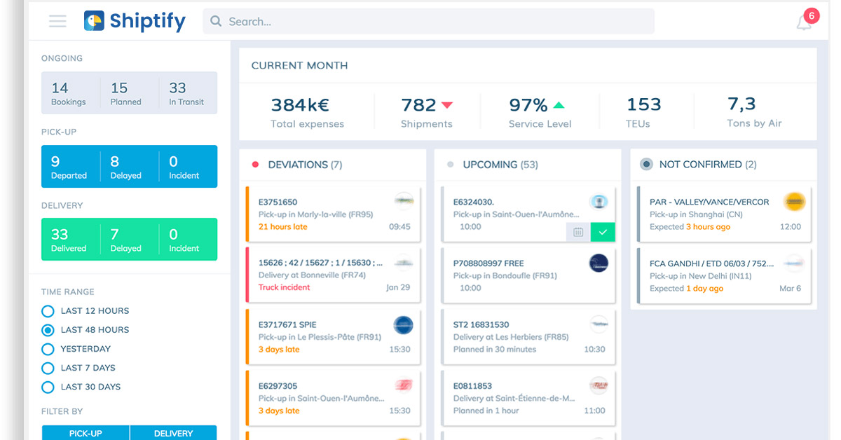 Shiptify est une suite de solutions digitales destinées à tous les acteurs de la supply chain. Également appelée Transport Management Platform (TMP), cette plateforme web collaborative a pour objectif de simplifier le pilotage des opérations de transport. Ce logiciel TMP permet d’obtenir une vision complète des activités, d’optimiser les flux de marchandises et de maîtriser l’ensemble des maillons de la chaîne logistique.