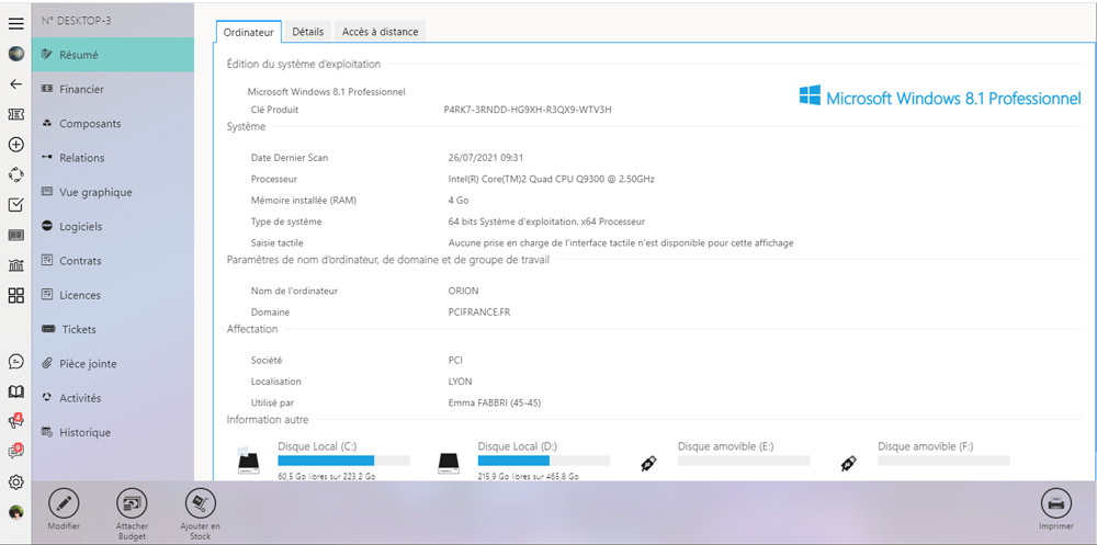 - Identification et gestion de biens : vous pouvez centraliser vos équipements (serveurs, pc, laptop, écrans et imprimante) ainsi que les composants hard et soft, de type processeur ou mémoire.