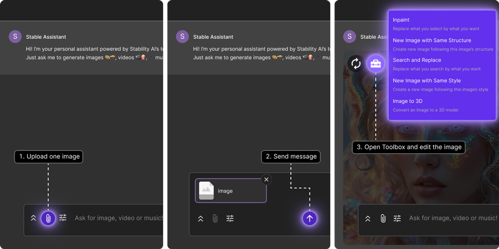 - Génération et modification d’images : au-delà d’un service de génération d’images à partir d’un prompt, Stable Assistant inclut des outils d’édition ou de transformation d’images. Par exemple, il peut remplacer, générer ou effacer un élément de l’image. Il est aussi capable de convertir une image en 3D ou de générer une nouvelle image avec le même style. L’utilisateur peut lui demander d’effectuer un zoom arrière, de coloriser des éléments ou de transformer une image en vidéo.