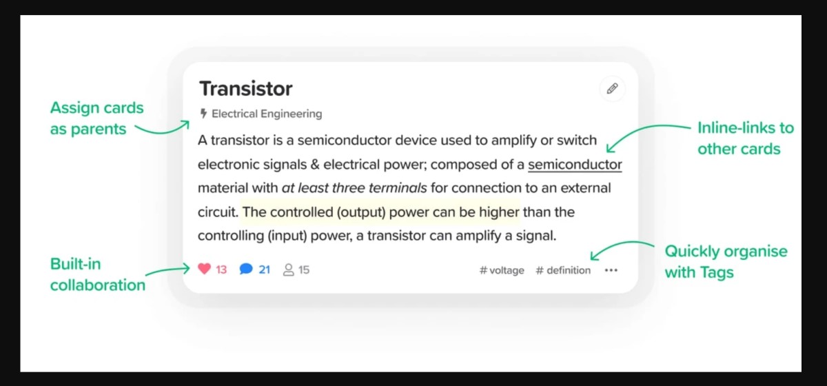 - La création de cartes de notes : les notes se présentent sous forme de cartes qui ont une limite de 1200 caractères. En plus des notes écrites, vous pouvez ajouter des images, des tableaux, des listes, des équations mathématiques, du code et des émojis.