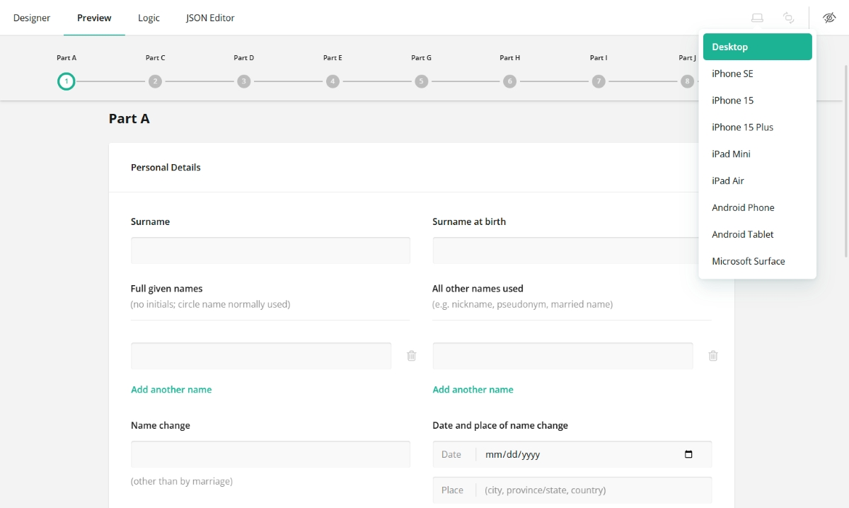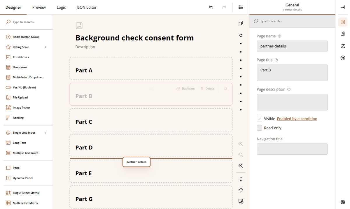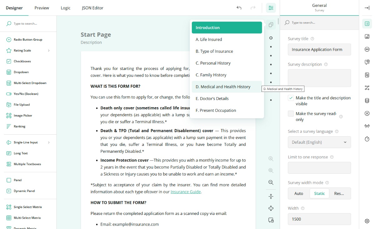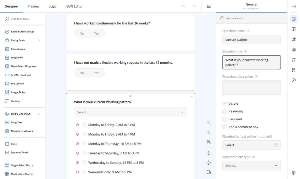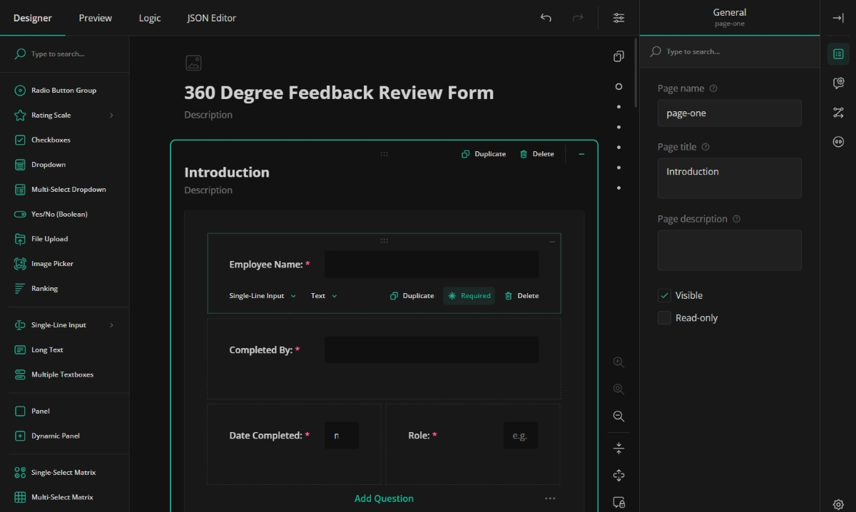 Survey Creator est le composant de SurveyJS dédié à la conception des formulaires. Il propose une interface drag-and-drop qui permet de créer des enquêtes, des quiz ou des formulaires multi-étapes sans écrire de code. Chaque élément ajouté sur l’interface de conception génère automatiquement un schéma en JSON, qui décrit la structure, la mise en page et le comportement du formulaire.
