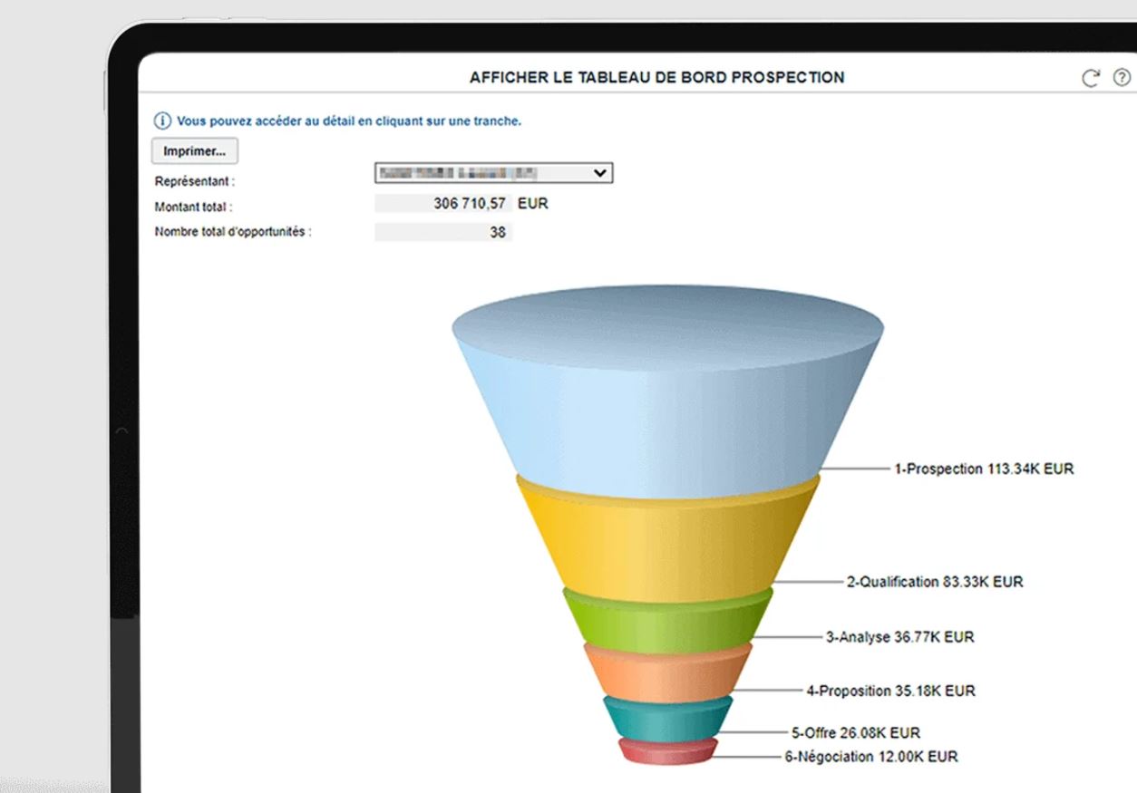 - Gestion des ventes : un CRM intégré et adapté au milieu industriel avec un suivi des opportunités, des offres et de vos commandes ainsi qu’un processus dédié aux relances.