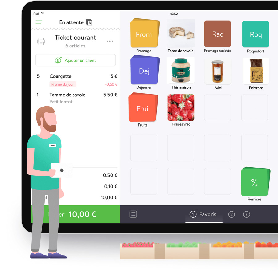 - Paiement : vos clients peuvent effectuer des paiements sans contact en Visa et Mastercard, et reçoivent leur ticket de caisse directement par mail.