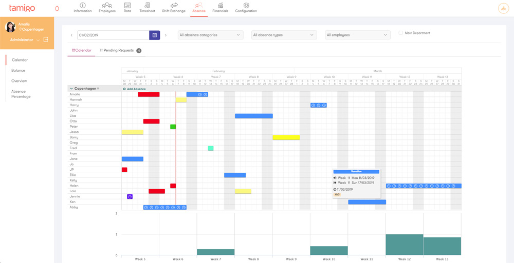 - Suivi du temps : tamigo conserve un enregistrement complet des heures travaillées. L’outil facilite le pointage des employés ainsi que la gestion des absences.