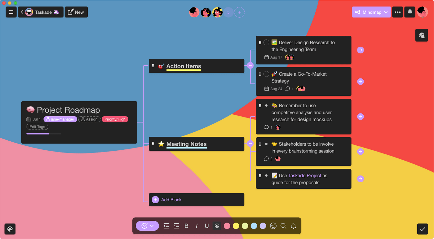 Taskade permet une gestion de tâches facile grâce à une interface unique et épurée. Vous pouvez créer des listes avec différentes types de listing de tâches (checklist, liste à puces, liste numérotée ou encore paragraphe texte) et les organiser sous plusieurs formes : au format liste, tableau, calendrier d’actions ou encore mindmap.