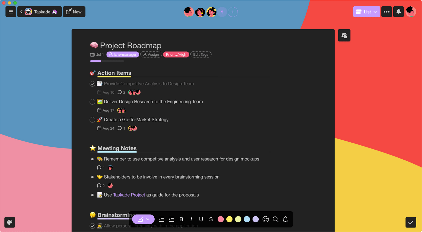 Taskade a été pensé pour la gestion collaborative. Créez des espaces de travail avec votre équipe pour pouvoir mettre en commun toutes les listes créées. Les modifications apportées aux différents fichiers sont visibles en temps réel et se sauvegardent automatiquement. Un chat est accessible à tout moment sur la droite de l’interface. Au travers de ces conversations, vous pouvez mentionner des collaborateurs pour les tagguer, envoyer des fichiers et lancer des appels audio et vidéo.
