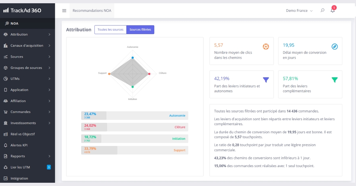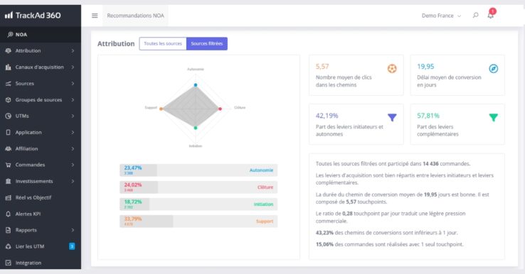 Le module TrackAd 360 accompagne les acteurs e-commerce dans l’analyse précise de la performance de leurs leviers d’acquisition. La plateforme consolide les données issues des différentes sources marketing et restitue une lecture claire de la contribution de chaque canal, source et campagne.