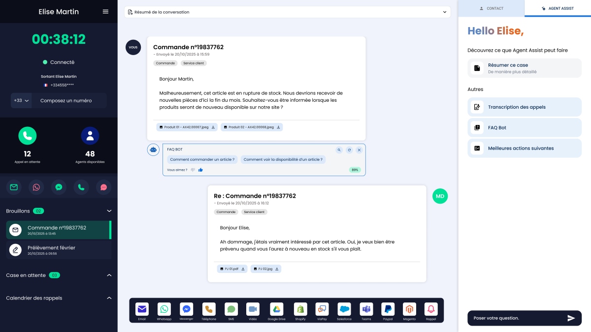 ViaDialog centralise, au sein d’un environnement unifié, l’ensemble des canaux de communication : voix, email, chat, SMS, messageries instantanées et vidéo. Les conseillers disposent d’un centre de contrôle leur permettant de suivre les interactions en temps réel, d’ajuster la répartition des flux et de veiller au respect des engagements de service. L’intégration native avec des outils tels que Salesforce, HubSpot, Microsoft Dynamics ou Zendesk assure une circulation fluide de l’information et une fiabilité renforcée des données.