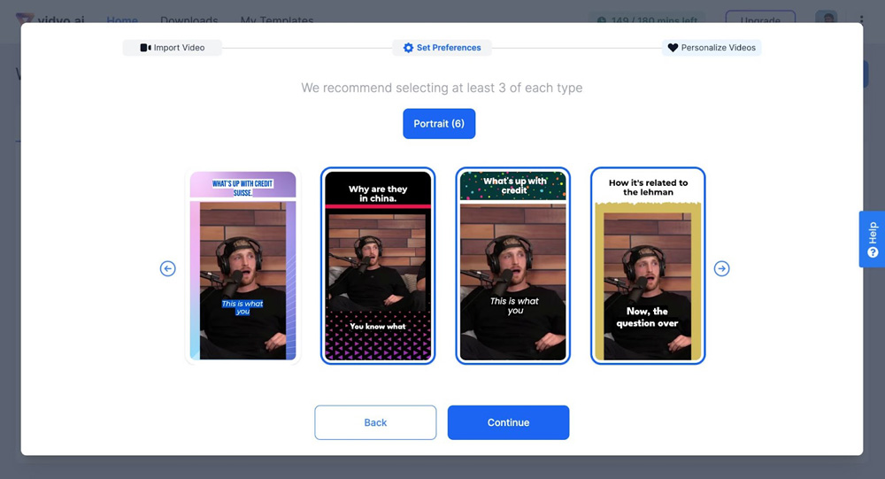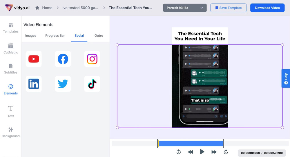 - Modèles pour les réseaux sociaux : Vidyo.ai dispose d’une bibliothèque de modèles pour créer des vidéos ajustées aux exigences des différents réseaux comme Instagram, TikTok, YouTube, etc.