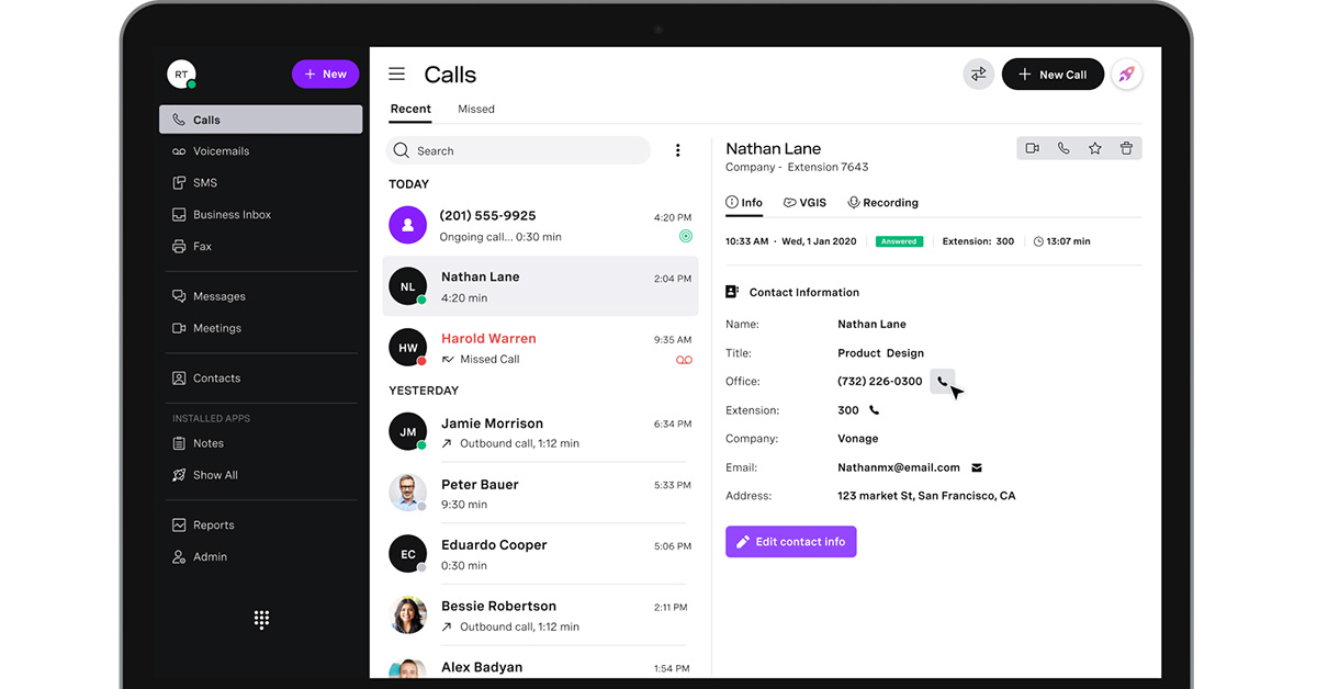 Développée par l’entreprise suédoise Ericsson, Vonage est une solution VoIP (Voice over IP) permettant de transmettre la voix sur des réseaux compatibles IP (Internet ou réseaux privés ou publics). Ce système téléphonique basé sur le cloud s’adresse aux entreprises à la recherche d’une plateforme unique pour grouper leurs communications internes comme externes, sur messagerie instantanée, vidéoconférence, SMS ou téléphone. Vonage est un logiciel en mode SAAS, supporté par tous les systèmes d’exploitation (Windows, Mac, OS mobiles…) et accessible depuis un navigateur web.