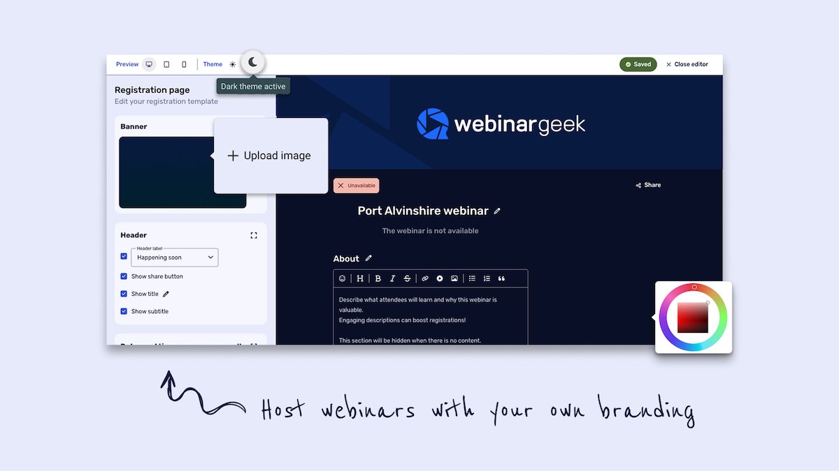 Chaque webinar peut être intégralement adapté à l’identité visuelle de l’entreprise, de la page d’inscription à l’interface de diffusion en passant par les e-mails automatisés, grâce à un éditeur s’appuyant sur un système de glisser-déposer. Sur le plan de la qualité vidéo, les intervenants peuvent diffuser une présentation, une vidéo ou le contenu de leur écran, avec une qualité d’image pouvant atteindre la HD+. Une option de streaming RTMP, offrant un débit binaire supérieur, est également disponible.
