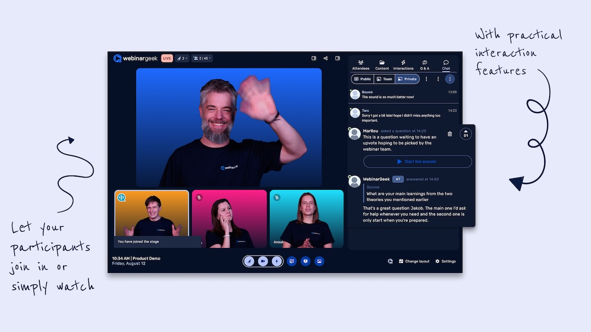 Pendant la session, WebinarGeek met à disposition plusieurs outils pour maintenir l’attention des participants. Il est possible de déployer un chat public et privé, des quiz, ou différents types de call-to-actions. Ces interactions peuvent être planifiées ou déclenchées manuellement. Il est également possible de simuler du chat ou des sondages pour des sessions automatisées, afin de reproduire la dynamique d’un événement en direct.