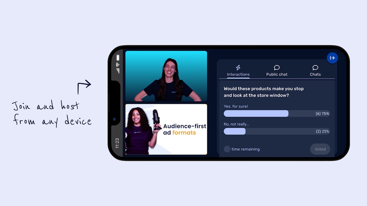- À partir de 69 € par mois : la formule Premium comprend des webinars illimités jusqu’à 1 000 spectateurs et 100 présentateurs, avec sous-titres en direct, statistiques avancées, analyse IA et intégrations natives. Le tarif mensuel varie selon le nombre de spectateurs par session.