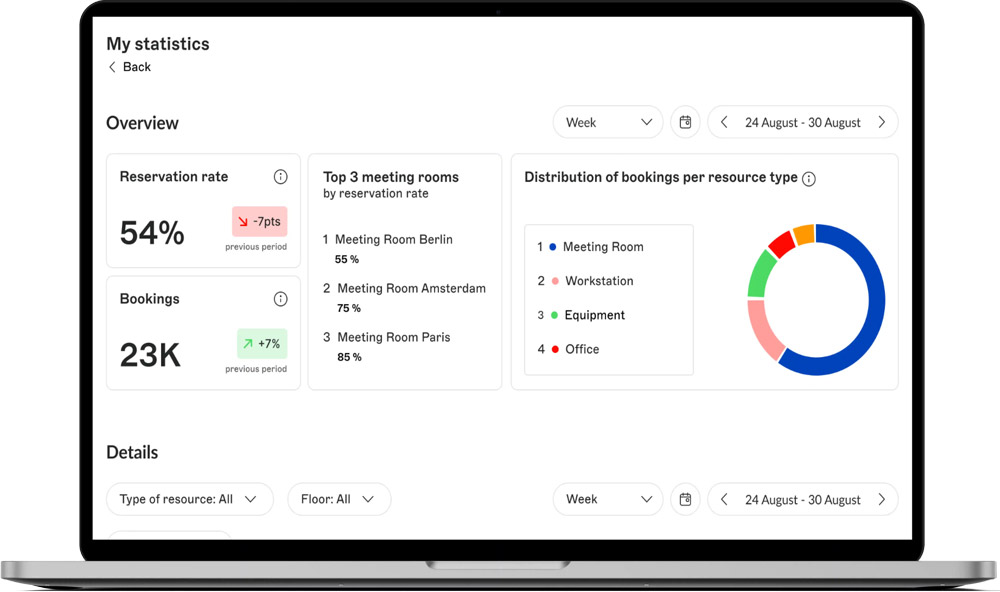 - Vérification des statistiques : vous pouvez vérifier les statistiques en temps réel afin d’identifier des modèles tendance, comme les pics d’occupation durant la semaine ou la présence de vos collaborateurs. Ces statistiques vous permettent d’améliorer les performances de votre CSR et de prévoir vos futurs besoins.
