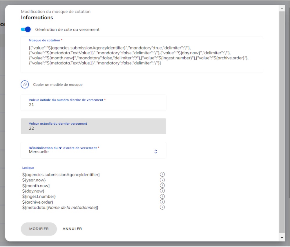 - Archives internes : ce module fournit les outils nécessaires pour la gestion autonome des archives physiques conservées dans les locaux de l’organisation, facilitant la logistique des différents sites de conservation.