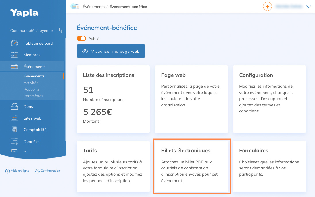 - Événements : Yapla offre la possibilité de créer des événements gratuits ou payants (rencontres culturelles, congrès, activités sportives, assemblées générales…) et de commercialiser des billets.