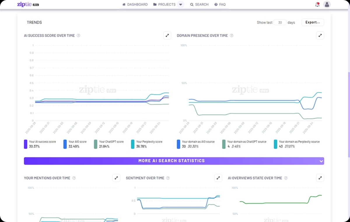 ZipTie est une plateforme SaaS qui permet de suivre et d’analyser la visibilité d’une marque dans les moteurs de recherche alimentés par l’IA. L’outil couvre ChatGPT, Perplexity et Google AI Overviews, et s’adresse aux équipes SEO, aux marketeurs et aux entreprises qui souhaitent comprendre leur positionnement dans ce nouvel écosystème de recherche.
