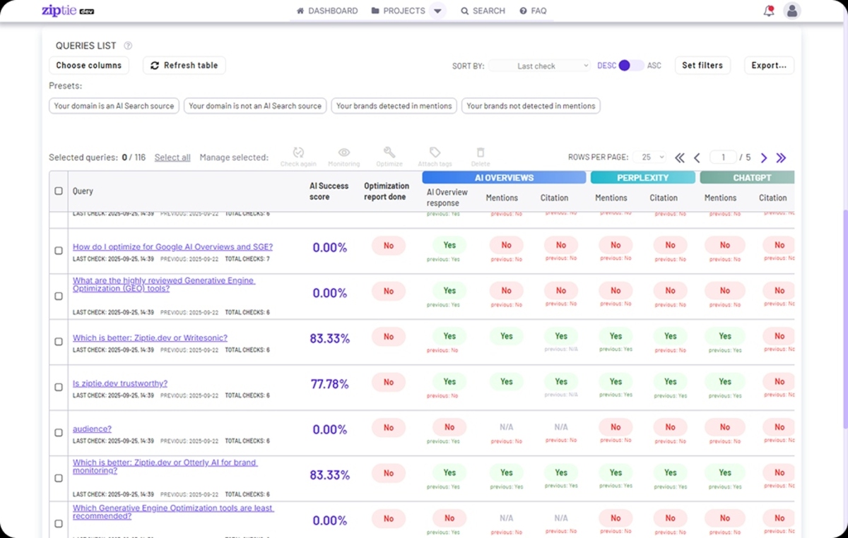 - Optimisation de contenu : ZipTie fournit des recommandations pour adapter ses contenus et améliorer ses chances d’apparaître dans les résultats de recherche IA.