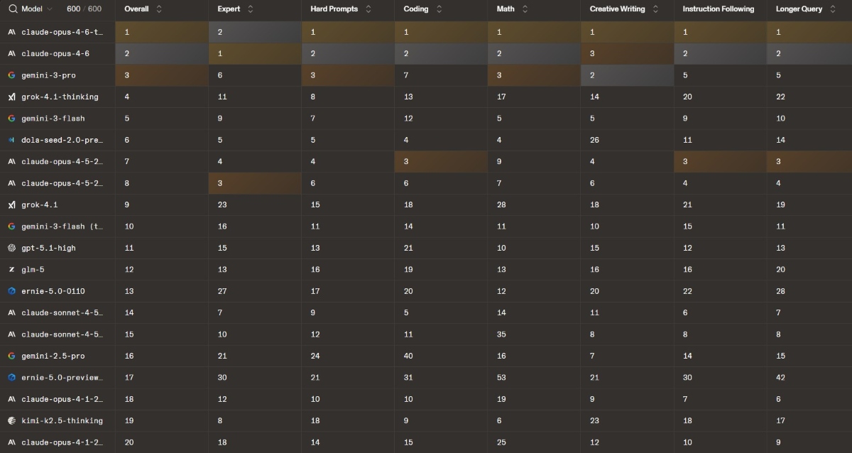 Si les modèles de Gemini se démarquent par leur constance, ceux d’Anthropic se sont révélés plus instables. Mais depuis juin, et le changement de format de la LMArena, l’éditeur de Claude n’a cessé de grimper dans le leaderboard. En février 2026, les modèles Opus 4.6 (et sa version Thinking), dévoilés en début de mois, subtilisent la première place à Gemini 3 Pro. Ils se démarquent dans presque tous les domaines dits « généralistes », comme la réponse aux longues requêtes et aux prompts complexes, l’écriture créative ou encore le suivi d’instruction. Dans le reste du top 10, on retrouve Gemini, solide 3e, mais également Grok et Dola.