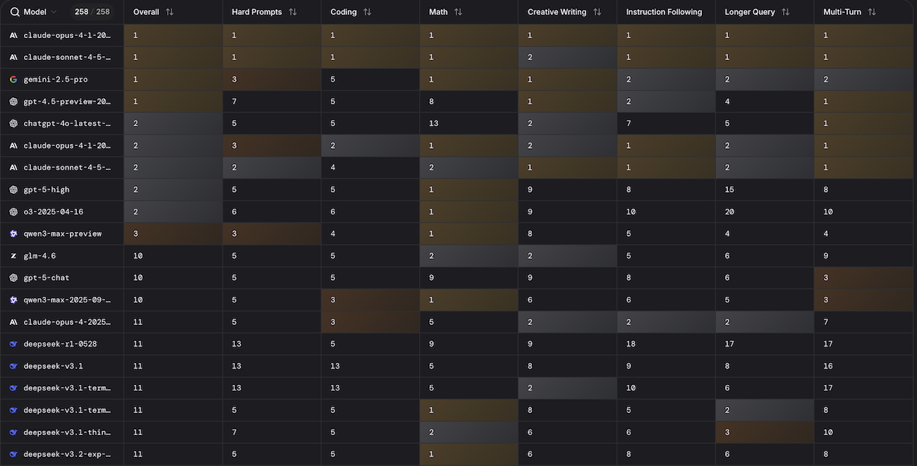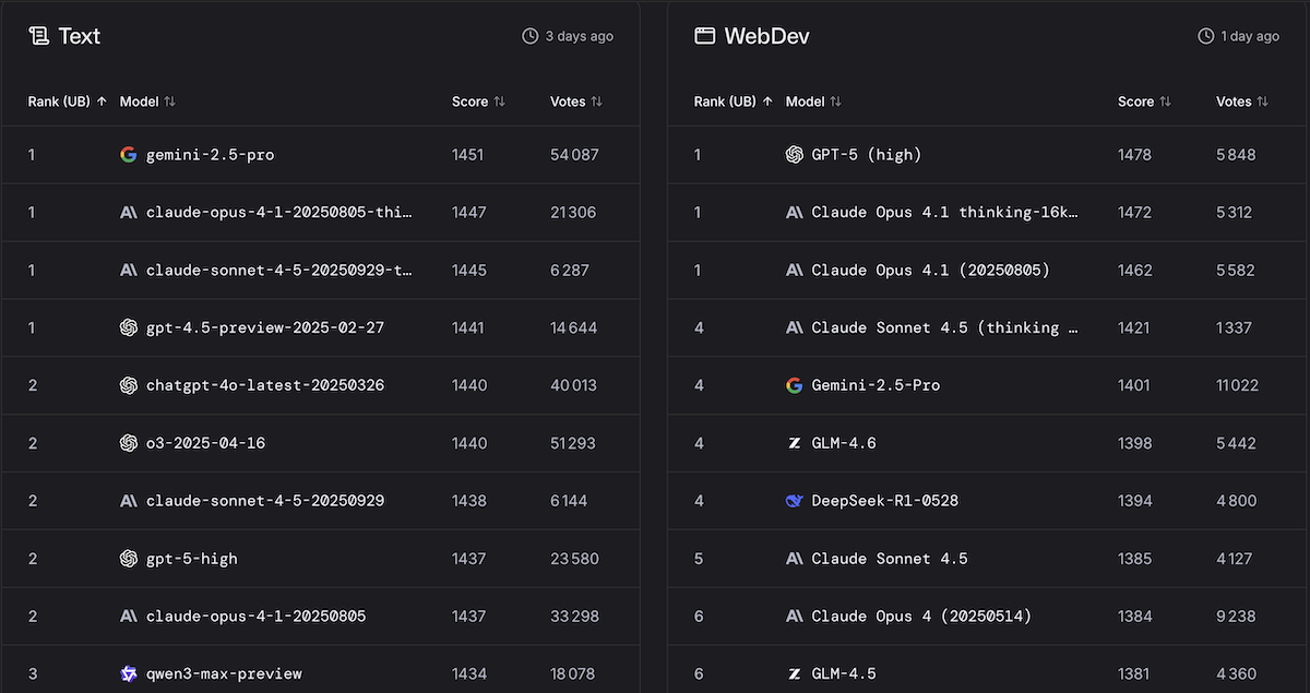 - Génération de texte : Gemini 2.5 Pro reste leader dans ce domaine, devant les deux modèles « thinking » de Claude, à savoir Opus 4.1 et Sonnet 4.5. GPT-5 n’est que huitième, dépassé par trois anciens modèles d’OpenAI.