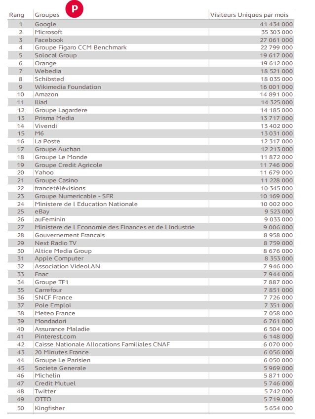 Pour ce qui est des sites les plus visités, Google est loin devant (40 millions de VU par mois et 15,8 millions par jour) Facebook (26,9 millions par mois, 8 millions par jour) et Microsoft ( 24 millions / 3 millions) . YouTube, Orange, Leboncoin, Wikipedia, Skype, PagesJaunes et Amazon complètent le Top 10.