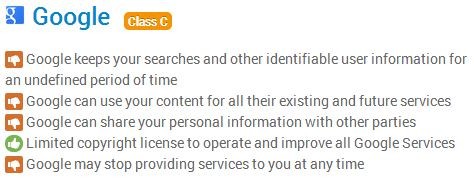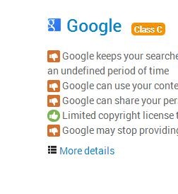 Un site a décidé de changer cela et de combattre ce désintérêt envers les conditions d’utilisation. Nommé ToS;DR (pour Terms of Service; Didn’t Read, déclinaison pertinente du fameux Too Long; Didn’t Read), le site recense les conditions d’utilisation de plus de 70 sites, services et mêmes jeux en ligne. Chacune d’entre elles est dissequée puis notée avec différents badges : bloquant, mauvais, neutre, bon. Il est intéressant de voir que tout le monde peut réagir et débattre sur les passages mis en avant. Lorsque les conditions ont été suffisamment analysées, une note est donné à chaque service, allant de du meilleur (Class A) au pire (Class E).