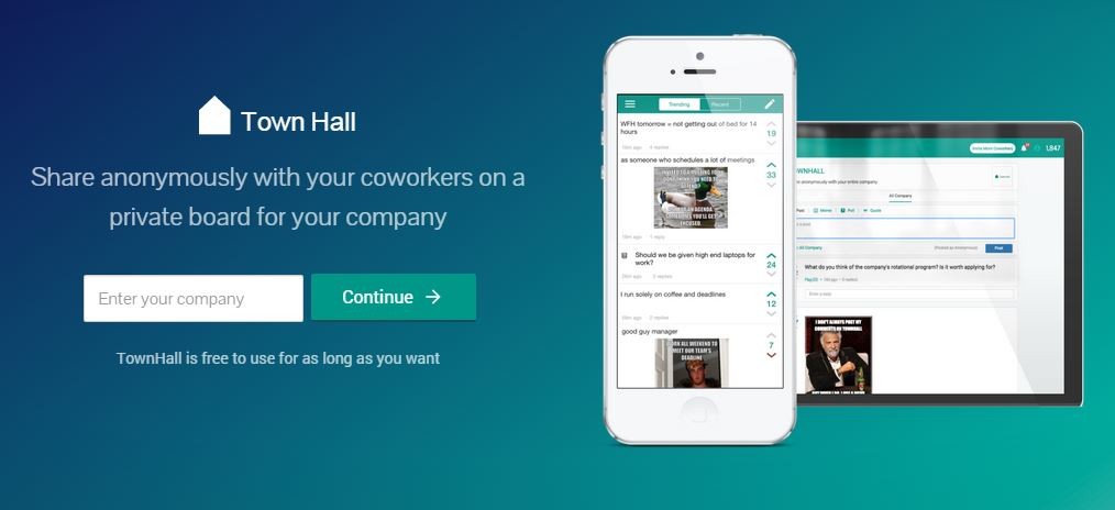 Contrairement à Memo, il ne s’agit pas uniquement d’une application iOS : Town Hall est également dispo en version web. Les développeurs du réseau social anonyme expliquent que grâce à Town Hall, vous allez enfin savoir ce que tout le monde pense tout bas dans votre société, et que ce « feedback anonyme » ne peut que favoriser la réussite de l’entreprise. Qu’en pensez-vous ?