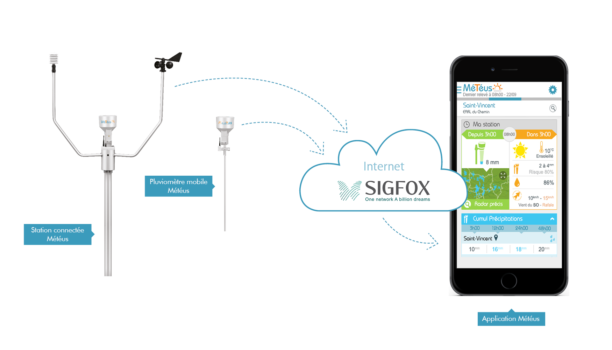 Cet objet connecté envoie les données captées (température, vent, hygrométrie…) à l’application. L’agriculteur obtient ainsi un relevé météo en temps réel géolocalisé, un historique de ses relevés météo ainsi que des prévisions précises, enrichies avec les données des autres stations Météus alentour.