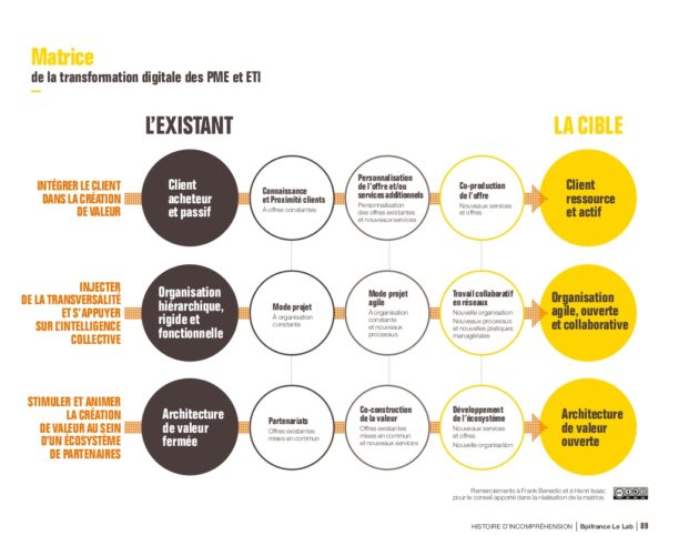 Pour aider les entreprises à opérer leur transformation, BPI France fournit cette matrice. Les trois chantiers sont présents (client, organisation, partenaires), de l’existant (pour les entreprises qui n’ont rien amorcé) à la cible, l’objectif. « Le dirigeant est en première ligne. C’est à lui de construire une vision, fixer le cap et partager avec ses équipes. Le facteur humain est la variable clé de la réussite du projet ».