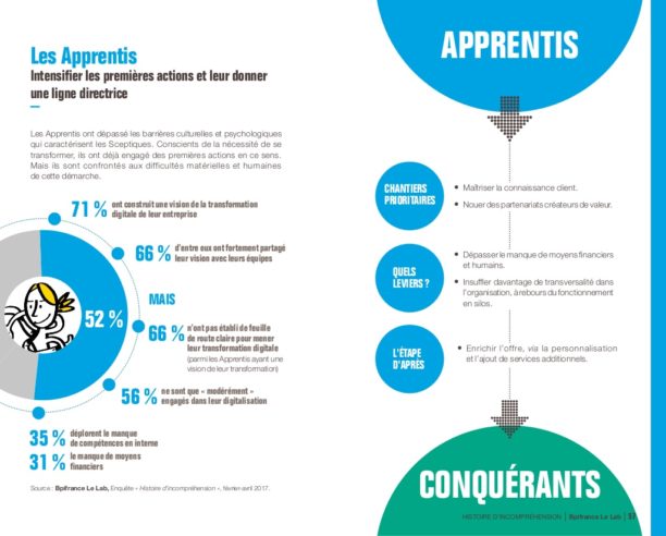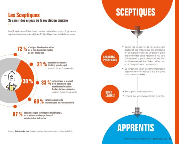 Selon la classification adoptée par BPI France, 38% des dirigeants sont sceptiques, 52% sont apprentis et 10% sont conquérants. Des fiches ont été réalisées pour rassembler les caractéristiques communes de ces catégories.