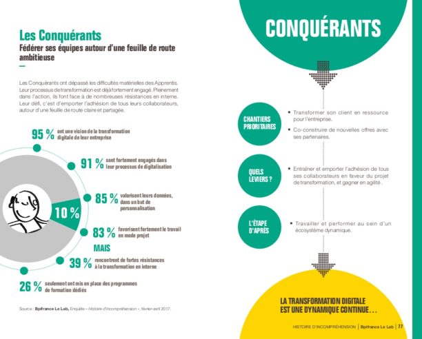 Les conquérants « sont pleinement engagés dans la transformation digitale de leur entreprise et bougent de nombreuses lignes ». Objectif : fédérer les équipes. Ils réussissent à surmonter les résistances internes, comprennent l’intérêt d’associer les clients au processus de création de l’entreprise et savent capitaliser sur des partenariats à forte valeur ajoutée.