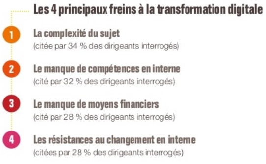 Si les dirigeants de PME/ETI ont du mal à amorcer la digitalisation de leurs sociétés, c’est bien parce qu’il s’agit d’un sujet complexe, auquel ils sont peu formés. Les principaux freins cités par les répondants sont la complexité du sujet (34%), le manque de compétences en interne (32%), le manque de moyens financiers (28%) et les résistances au changement en interne (28%).