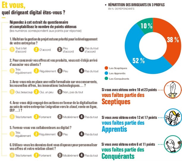 Selon la classification adoptée par BPI France, 38% des dirigeants sont sceptiques, 52% sont apprentis et 10% sont conquérants. Des fiches ont été réalisées pour rassembler les caractéristiques communes de ces catégories.