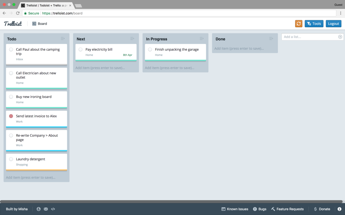 Votre cœur balance entre Trello et Todoist pour gérer vos tâches ? N’hésitez plus : des développeurs ont eu la bonne idée de combiner le meilleur des deux outils. Trelloist permet de visualiser et gérer ses tâches Todoist sur un tableau Kanban.