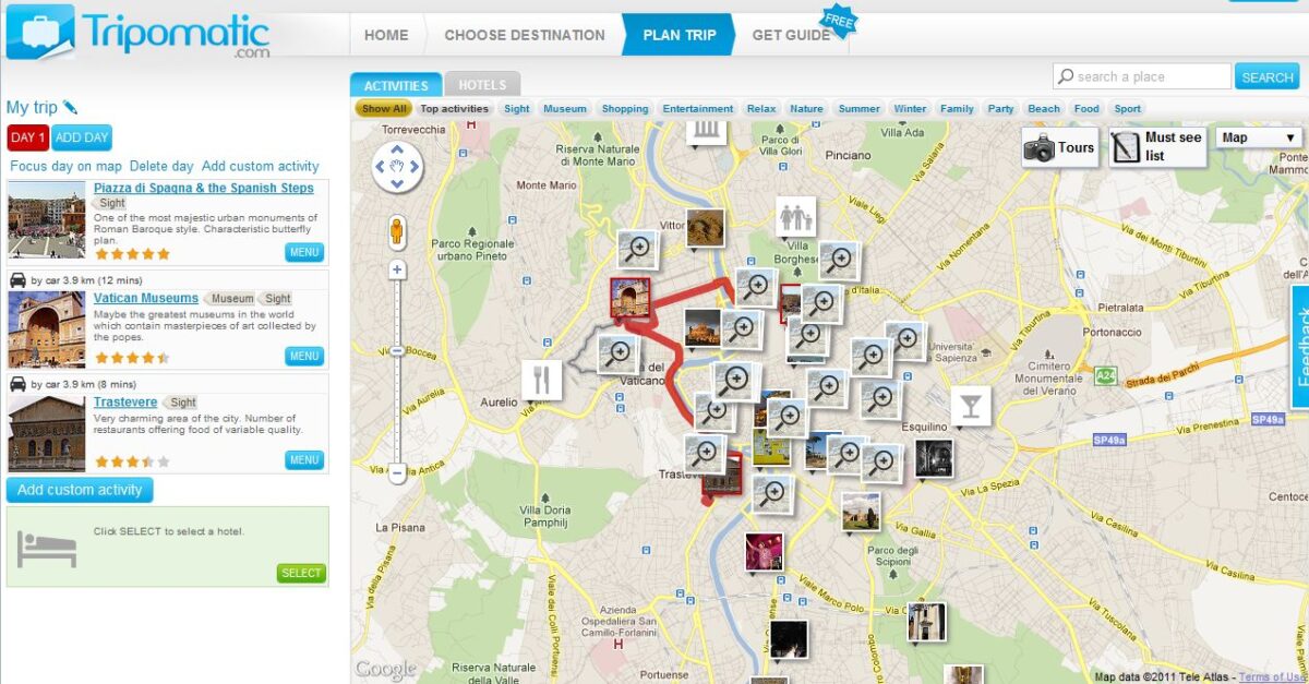 Lancé très récemment, Tripomatic est mon gros coup de coeur. Il permet, pour une destination précise, de planifier ses journées en choisissant les endroits que l’on souhaite visiter. Tripomatic va calculer ainsi l’itinéraire que vous aurez besoin d’effectuer : vous pouvez choisir votre mode de déplacement (voiture ou piéton), et les déplacements nécessaires sera indiqué et chronométré en fonction de celui-ci. Vraiment très pratique, quand on a du mal à estimer les temps de parcours sur une carte, dans une ville inconnue ! Une fois votre destination choisie, vous aurez accès à des sites touristiques déjà pré-remplis, avec des informations s’y attachant, ou bien vous pourrez entrer librement les endroits que vous souhaitez visiter. Tripomatic contient également un répertoire des hôtels et autres moyens d’hébergement, que vous pourrez ajouter à votre carte. Le site de planifier vos voyages sur plusieurs journées. Si vous vous créez un compte (possible aussi avec Facebook Connect), vous pourrez programmer plusieurs destinations, et, cerise sur le gâteau, télécharger un PDF avec le récapitulatif de votre voyage.