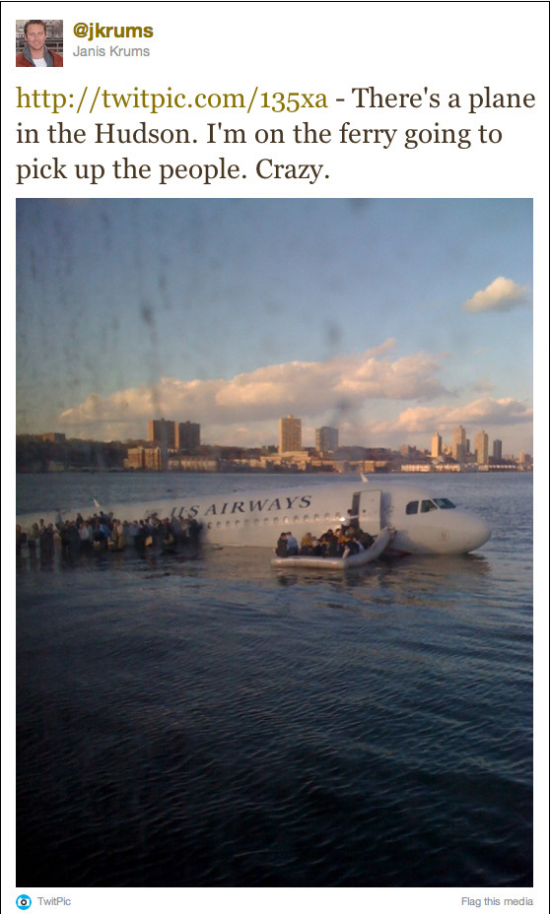 Vous vous rappelez sûrement de cet avion qui avait atterri au milieu da la rivière Hudson en plein New York. Ce tweet est considéré comme un des premiers tweets de « citizen journalism ».