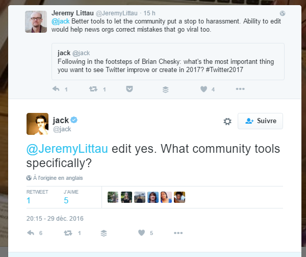 Cette fenêtre permettrait de corriger les erreurs et coquilles d’un tweet pendant quelques minutes, sans en changer le sens. Twitter devient de plus en plus un espace de prise de parole publique (difficile de ne pas penser aux tweets tonitruants de Trump) et cet espace ne doit pas être corrompu avec des modification de tweets a posteriori. On ne sait pas trop si cette fonctionnalité verra le jour (ni quand), mais ce qui est sûr c’est que Jack et Twitter « y pensent beaucoup ». L’autre demande qui revient beaucoup de la part des utilisateurs est la lutte contre le harcèlement, et contre le spam.
