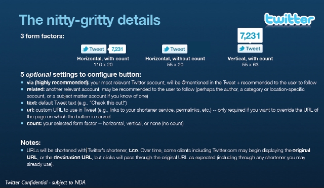 Trois formes de boutons seront disponibles. Quelques options de personnalisation aussi, comme la possibilité d’ajouter une phrase type ou de passer par son propre raccourcisseur d’URL. Reste à savoir si les blogueurs et éditeurs de sites changeront leur bouton actuel pour celui-ci. Il y a des chances que oui ! Ce dernier devrait être disponible avant ce week-end.