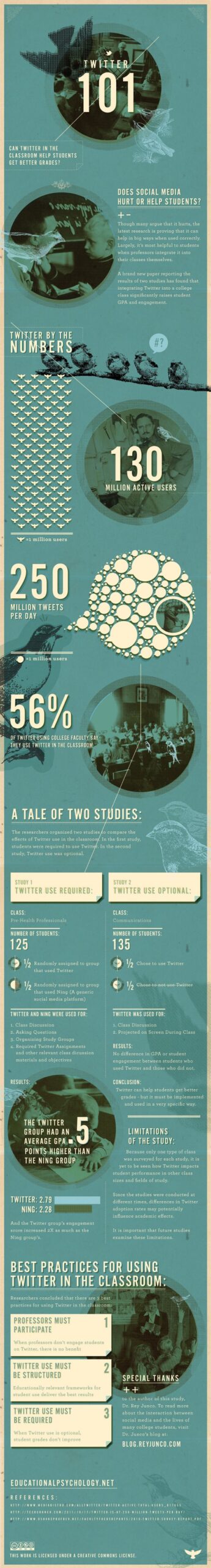 Cependant, deux études menées en milieu scolaire montrent que l’utilisation de Twitter peut augmenter les notes et la motivation des étudiants. La première étudie les différences de résultats entre des utilisateurs de Twitter et de Ning, la seconde évalue les disparités entre les membres de Twitter et les non-membres. C’est intéressant, dans le sens où 56% des étudiants, membres du réseau social, déclarent se rendre sur Twitter pendant leurs cours. Bien-sûr, cette utilisation doit être encadrée pour que les résultats progressent : les professeurs doivent s’impliquer directement dans la démarche. Ensuite, les chercheurs conseillent de rendre obligatoire l’usage de Twitter pour qu’une amélioration soit visible. Enfin, les sujets doivent être directement en lien avec les matières abordées dans le cadre des cours. En une infographie, retrouvez les expérimentations effectuées dans le cadre de l’étude, ses limites et ses résultats.
