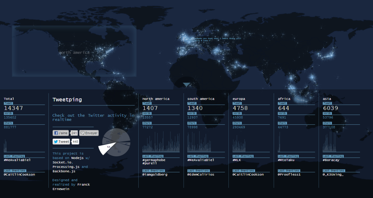 L’outil permet également de connaître le nombre de tweets, de mots et d’autres données générées depuis l’ouverture de Tweetping par l’internaute, dans le monde ainsi que sur chaque continent.